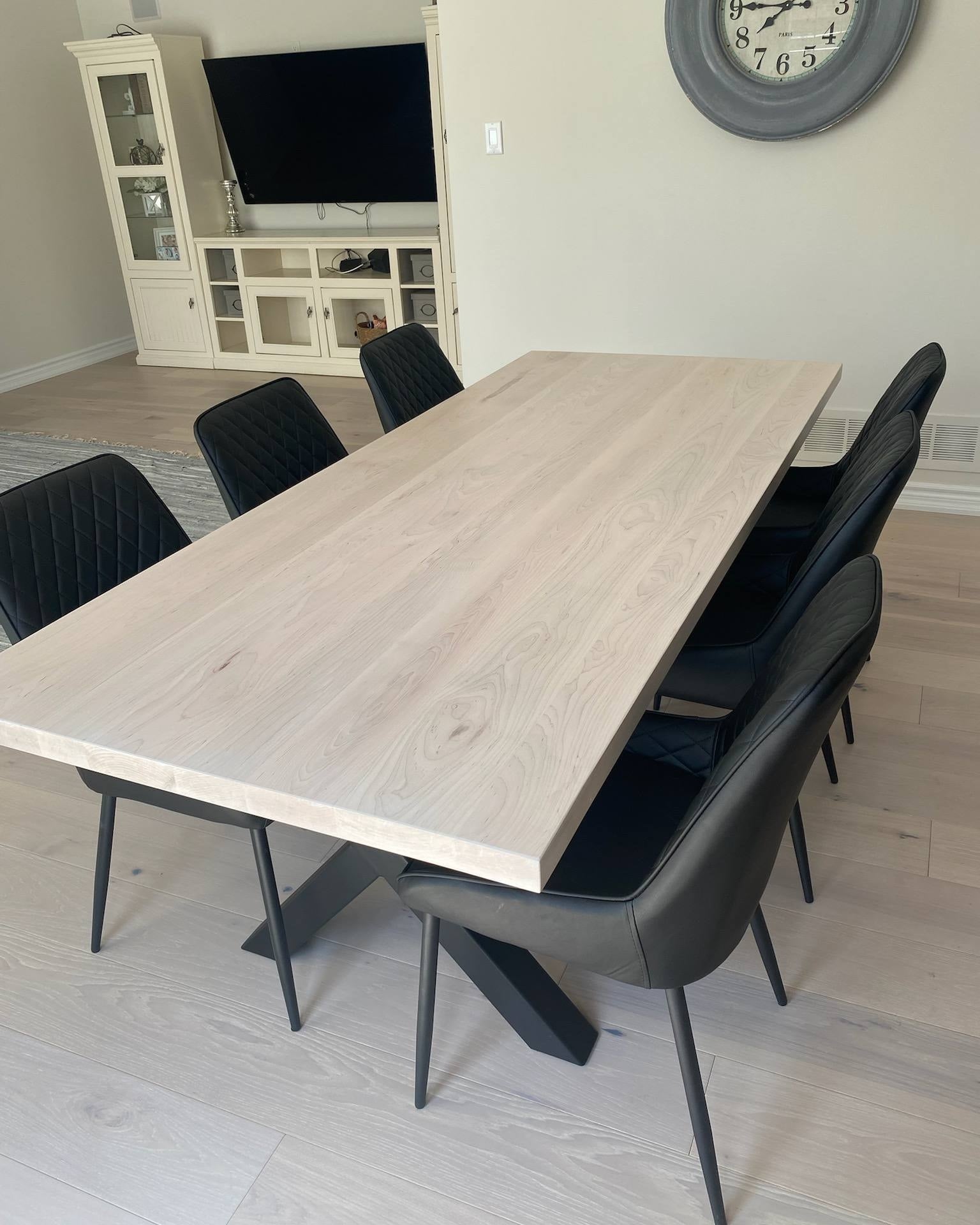 The classic Canadian Maple Table. Featuring the signature mineral streaks and pinholes of solid Wormy Maple, each tabletop is a unique masterpiece paired with clean, industrial metal U-legs or  X Shape. The base can also be solid wood U-legs or  X Shape.